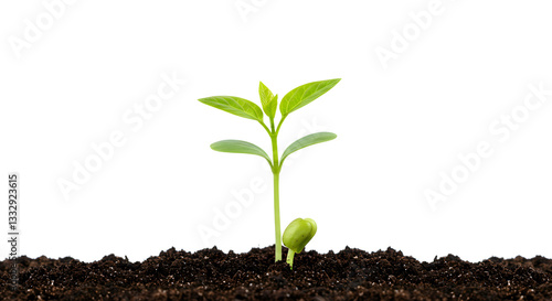 Imagen de un brote de plántula emergiendo de suelo marrón sobre fondo blanco