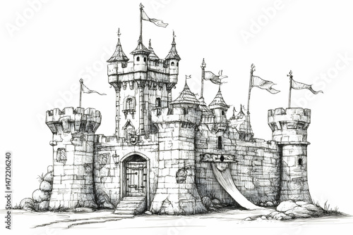 Imaginative Hand-Drawn Castle Design with Tower and Flags
