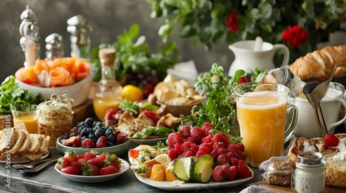 Imagine a breakfast spread with beautifully arranged food and refreshing morning beverages.