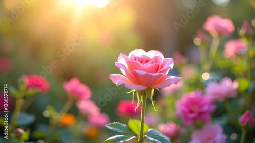 Imagine a breathtaking scene where a delicate soft pink rose blooms gracefully in a tranquil garden, bathed in the gentle embrace of morning light, The garden is a sanctuary of peace and beauty