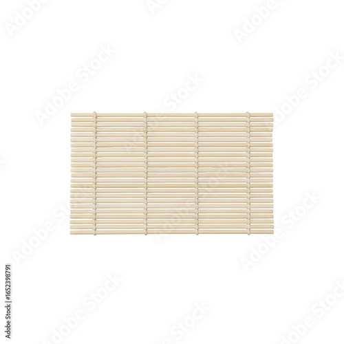 Immaculate bamboo rolling mat (makisu) with light slats, precisely joined, flat on transparent studio background, ultra-realistic top-down product shot, concept of pristine quality