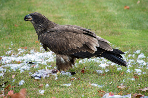 immature bald eagle eating a seagull on green grass