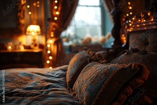 Immerse yourself in a cinematic detail shot highlighting the pillows in a luxurious English minimalist bedroom. Cinematic contour lighting adds depth to the highly detailed scene