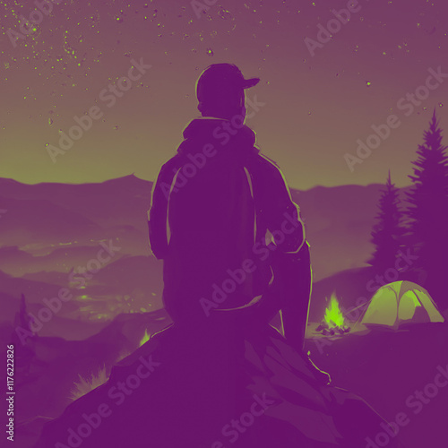 Immerse yourself in nature's wonder, as you witness the vibrant night sky with twinkling stars. Mountains stand tall in the backdrop, as the campfire and tent envelop you in warmth.