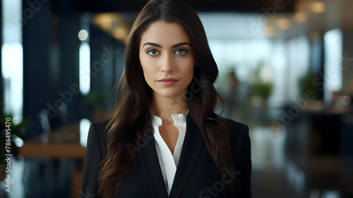 Immerse yourself in the corporate atmosphere as a young, accomplished businesswoman captures attention with her confident gaze and professional demeanor, portrayed with remarkable realism in HD