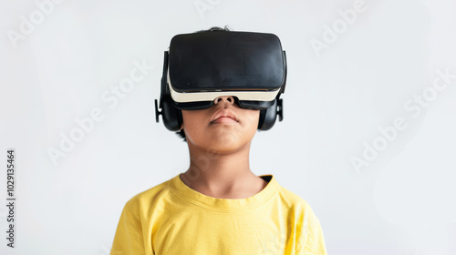 Immersed in virtual world, young boy wears VR headset, showcasing excitement of technology and gaming. His focused expression reflects curiosity and wonder
