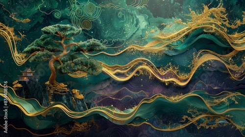 Immersive digital 3D mural with a rich green and purple nocturnal backdrop, adorned with flowing gold wave designs and a grand golden tree