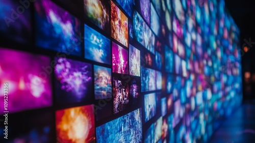 Immersive Digital Wall with Blurred Video Content.Concept of Digital age, information overload, immersive experience, virtual reality,Online news, media, advertising, technology, film industry, gaming