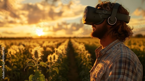 Immersive VR experience in a vibrant sunflower field at sunset. Man exploring virtual reality with nature's beauty. Future Farming Background. Technology meets tranquility.