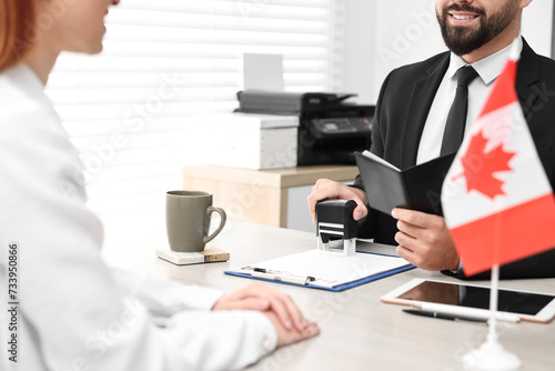 Immigration to Canada. Smiling embassy worker approving woman's visa application form in office, closeup