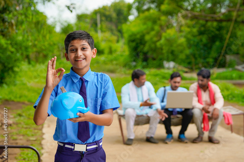 importance of saving concept : Smart indian little boy standing and holding piggy bank in hand at home.
