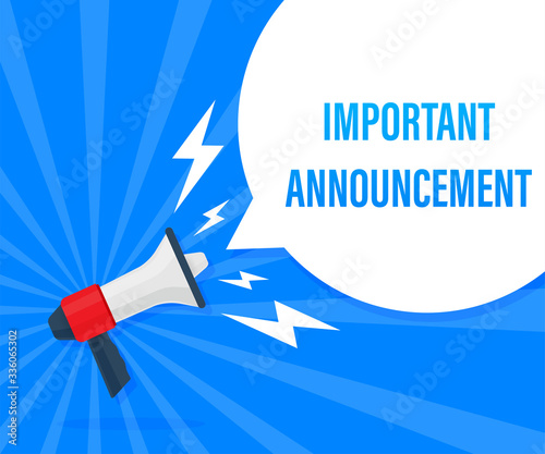Important announcement. Badge, stamp with megaphone icon. Flat vector illustration on blue background.