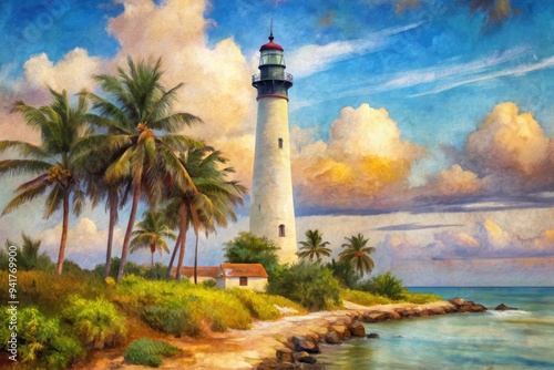 Impressionist Miami Lighthouse: Brushstrokes, muted colors, soft textures, painterly style, artistic interpretation