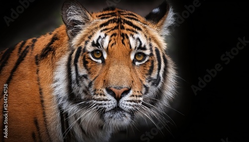 Impressive CloseUp Portrait of a Regal Bengal Tiger in Lush, Verdant Jungle, Showcasing Vibrant Stripes and Intense Eyes Set Against the Backdrop of a Moody Sunset