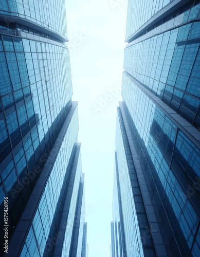 Impressive Low-Angle View of Twin Modern Glass Skyscrapers with Blue Sky