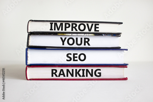 Improve SEO ranking symbol. Concept words 'Improve your SEO ranking' on books on a beautiful white background. Businessman hand. Business, Improve your SEO ranking concept.
