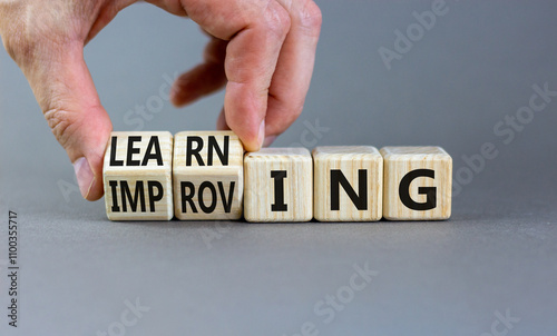 Improving or learning symbol. Businessman turns wooden cubes and changes the word Improving to Learning . Beautiful grey background. Educational business improving or learning concept. Copy space.