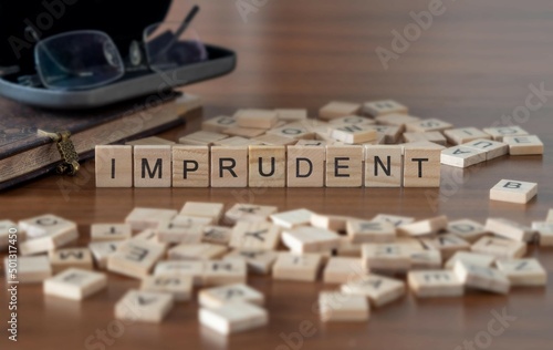 imprudent word or concept represented by wooden letter tiles on a wooden table with glasses and a book