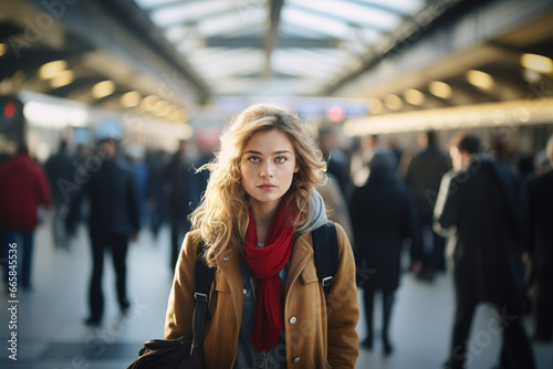 In a busy train station, a confident woman stands on the bustling platform, meeting the camera's gaze amidst a sea of hurried commuters and the urban pulse of city life