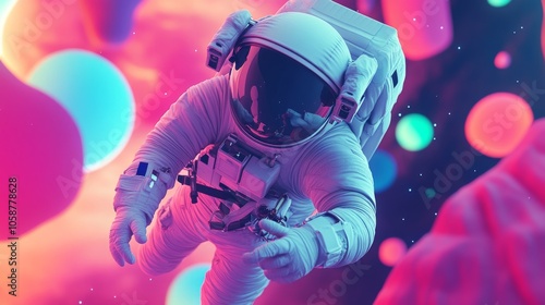 In a captivating cosmic environment, an astronaut drifts gracefully through space, surrounded by colorful abstract shapes and planets, symbolizing exploration and discovery.