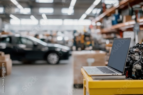 In a car workshop, a modern laptop is neatly placed on a table, symbolizing the blend of traditional car repair and contemporary digital technology.