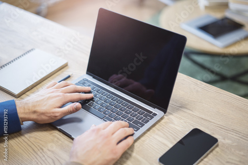 In a close-up shot, a man's hands are seen deftly typing on a modern laptop keyboard, set against a blurry office backdrop