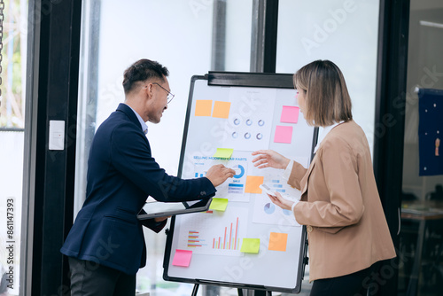 In a corporate meeting, a businessman leads a discussion on financial strategy, pointing at charts and graphs. The team collaborates on planning and analysis, using laptops and paperwork to ensure suc