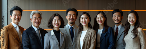 In a corporate setting, a diverse team of professionals, including Asian businessmen and businesswomen, stands confidently, embodying success and teamwork.