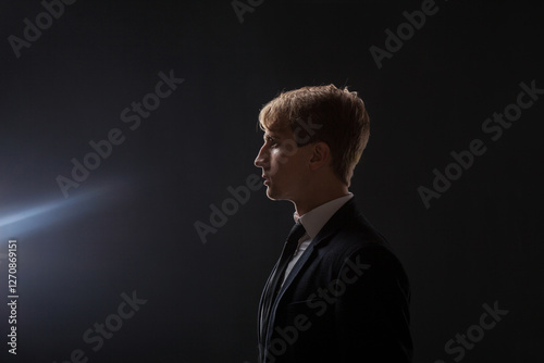 In a dark studio, a man in a black suit and white shirt stands in profile. The contrast between his attire and the shadowy background creates an air of mystery and professionalism.