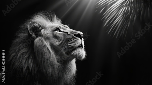 In a dimly lit setting, the lion intensely gazes toward the glowing light, highlighting its impressive mane and powerful presence that captivates all who see it