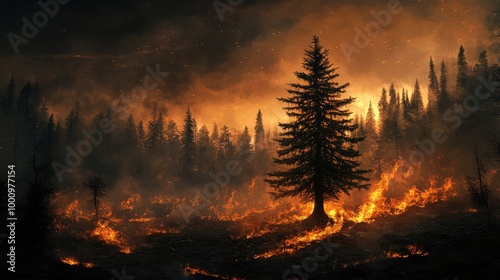 In a forest ravaged by fire, a resilient pine tree remains, with flames in the distance, symbolizing nature's struggle against environmental degradation.