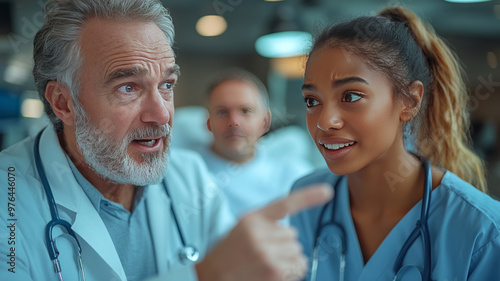 In a hospital room, a doctor angrily confronts a nurse as a concerned patient watches.