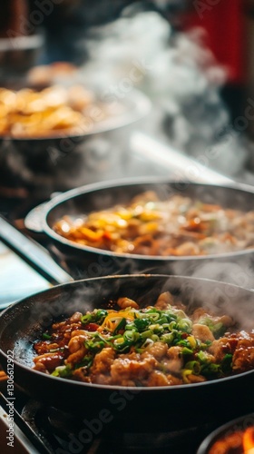 In a lively kitchen, multiple pans bubble with delicious stir-fry dishes, releasing fragrant steam. Colorful vegetables and tender meat create a mouthwatering sight