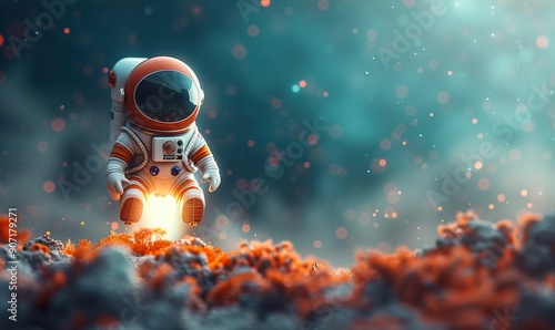 In a minimalist scene, a white astronaut rides a sleek rocket against a pastel blue sky, symbolizing a company's exciting startup journey, exploration, and innovation.