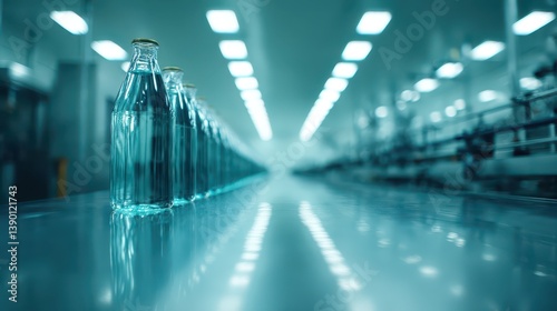 In a modern bioplastic production facility, glass bottles are meticulously arranged on a conveyor belt