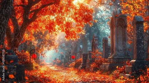 In a serene cemetery, a winding pathway is covered with bright orange leaves, illuminated by the warm glow of the setting sun filtering through the trees