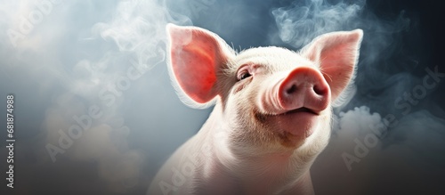 In a serene nature background, a cute domestic mammal, a brown and white pig, with a red face, is captured in a closeup portrait, emanating an adorable and charming presence, while a hint of smoke and