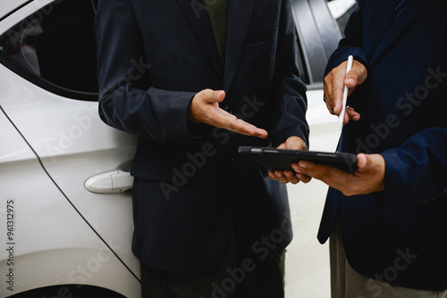 In a showroom, people engage in buying or leasing cars, working with salespeople to finalize contractsDiscussions involve choices agreements financingThe process includes paperwork explaining terms