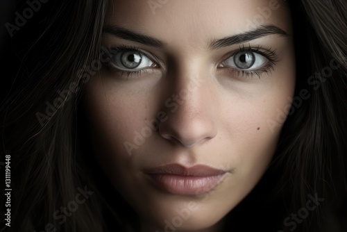 In a softly illuminated space, a young woman gazes directly at the viewer, her intense grey eyes shimmering with emotion and mystery, framed by flowing dark hair