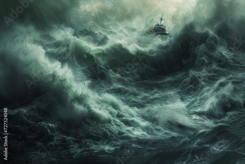 In a storm's fierce embrace, a solitary ship battles the tumultuous sea, its red hull a flicker of resilience against the might of churning waves.