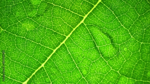 In a stunning close-up, a verdant leaf displays its intricate vein network, bathed in soft light. Its vibrant color and natural textures create a captivating visual symphony. Green leaf background.