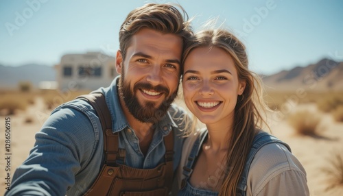 In a sun-soaked desert setting, a cheerful couple smiles at the camera, embracing the joy of their outdoor adventure. Surrounded by stunning mountains and sparse vegetation, they radiate happiness