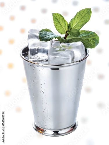 In a tin bottle, garnished with crushed ice and mint sprigs.