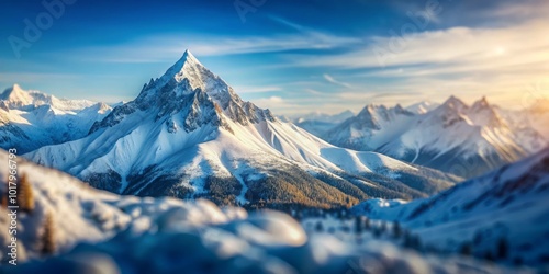 In a tranquil snowy mountain setting, cool tones blend beautifully with a tilt-shift technique, creating a minimalist photograph that evokes calm and