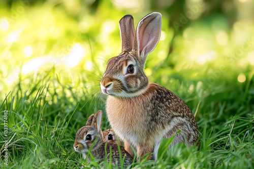 In a vibrant green meadow, two adorable rabbits are playfully lounging together under the warm sun on a beautiful spring afternoon