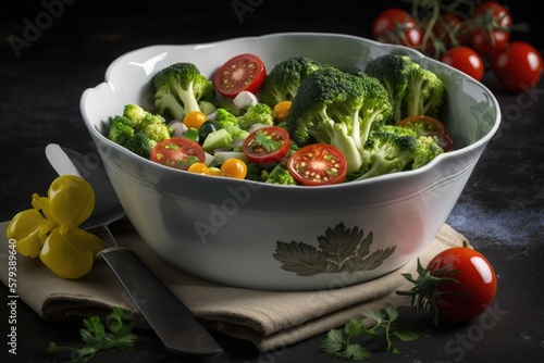 In a white ceramic bowl, there is a delicious salad made out of steamed broccoli and juicy tomatoes. The idea of eating healthily. Delicious and nutritious vegan dinner with organic vegetables. We nee