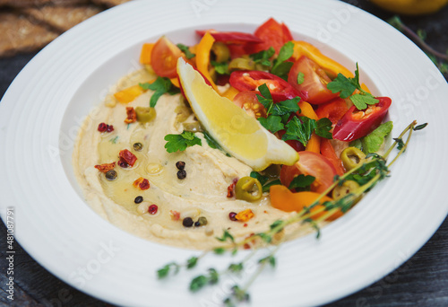 in a white plate hummus with a slice of lemon chopped hot pepper slices of tomato and spicy seasoning with sprigs of greenery on the edge