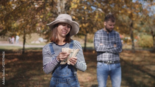 In an autumn park filled with colorful leaves, a smiling woman joyfully holds cash while a man stands behind her