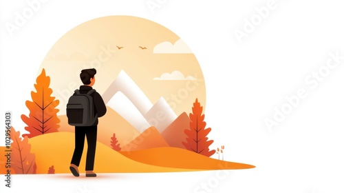 In an autumn scene, a solo traveler walks along a winding path. The landscape is adorned with colorful foliage, with birds soaring in the clear sky above.