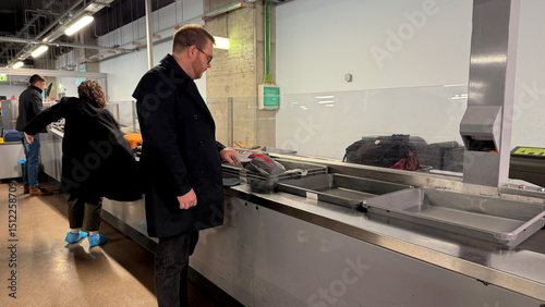 In an industrial backdrop, a Caucasian man dons a sleek coat, evoking customs rituals and International Human Solidarity Day